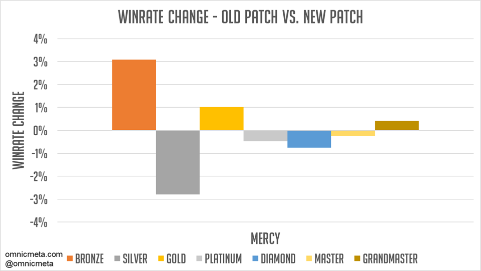 マーシーの勝率に変化がないのは、新パッチから使用率がどのティアーでもほぼ100%になったことで、両チームに常にマーシーが存在するために勝率が50%付近に留まるという結果になった。